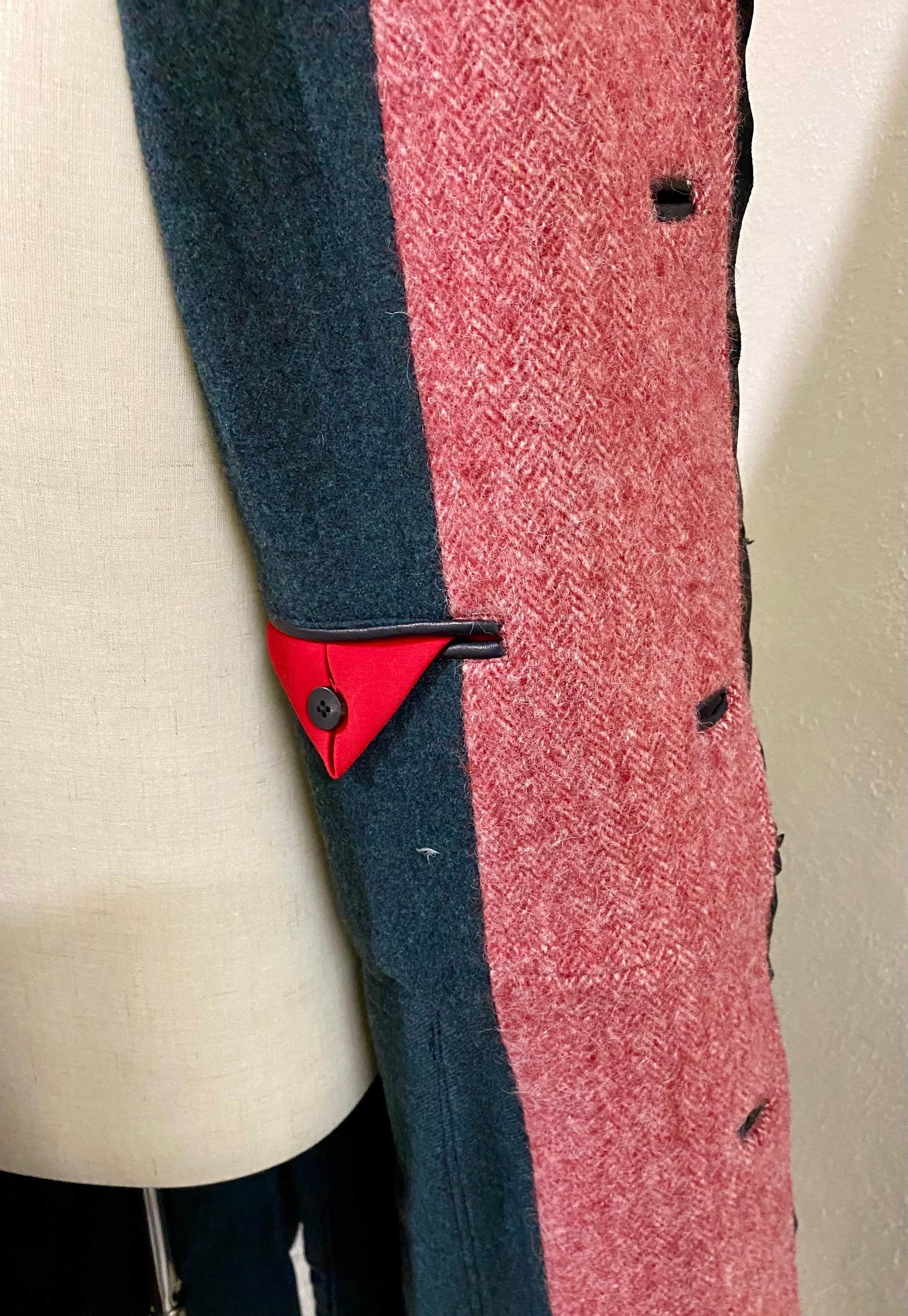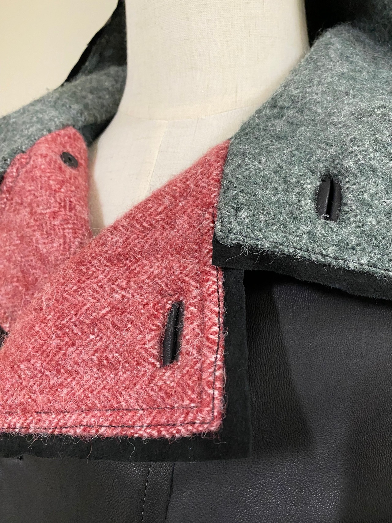 黒一色のクールな革に、襟元のウールの緑と赤が華やかさを添えている。