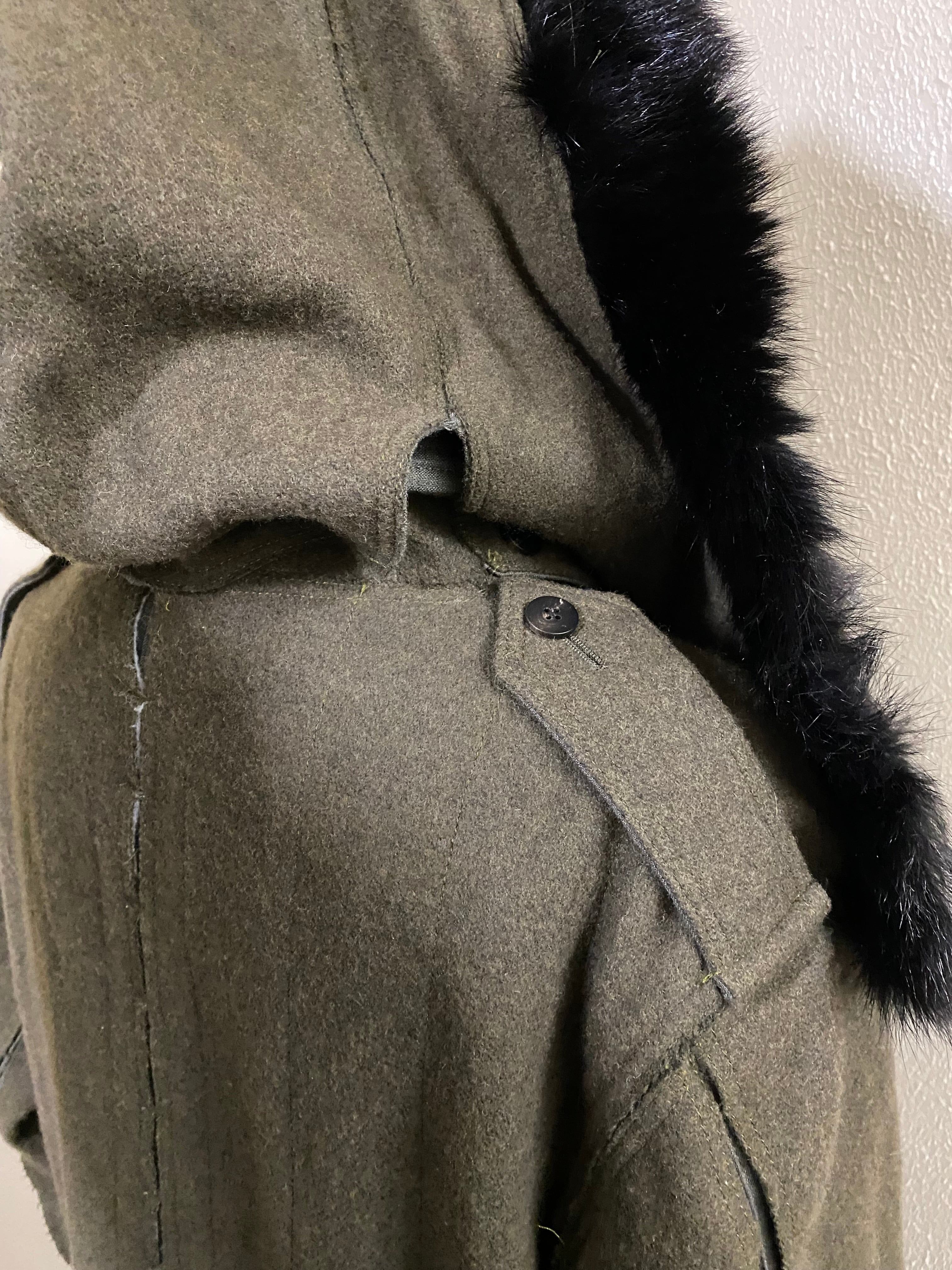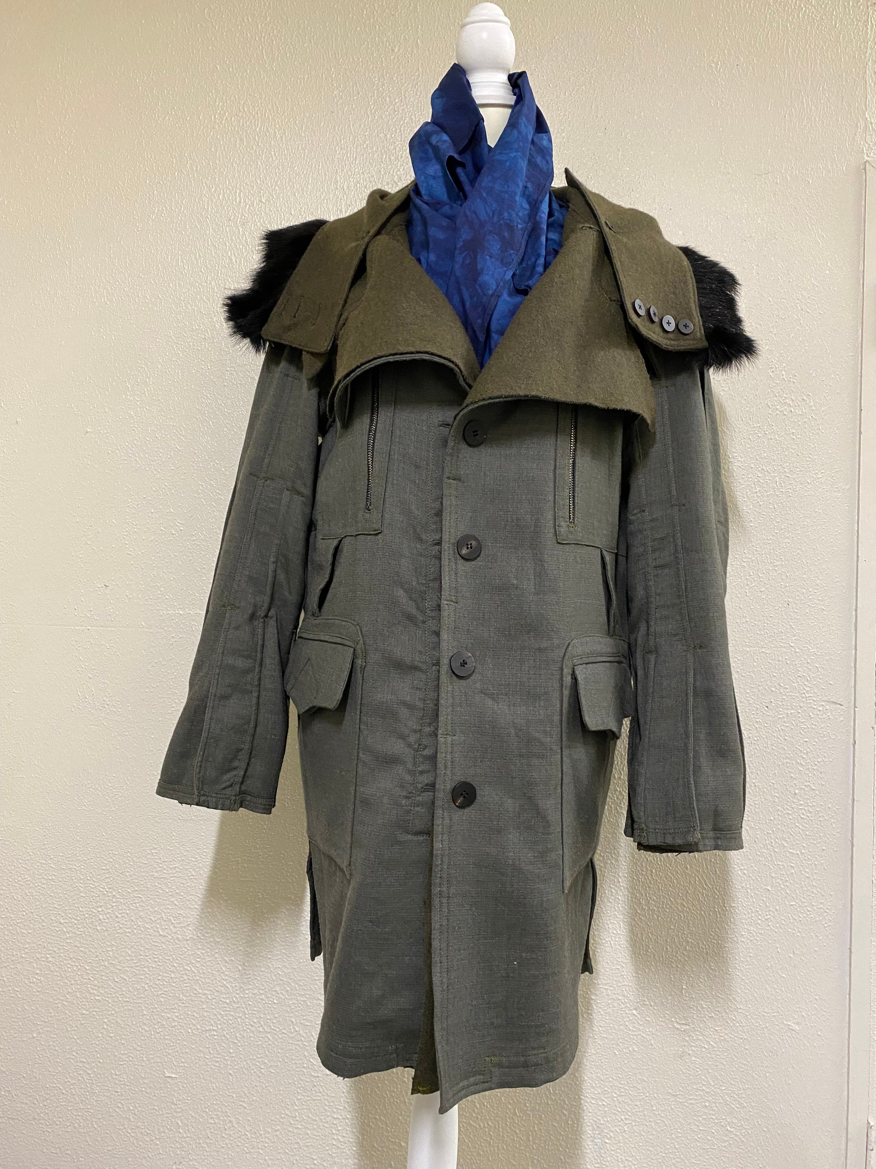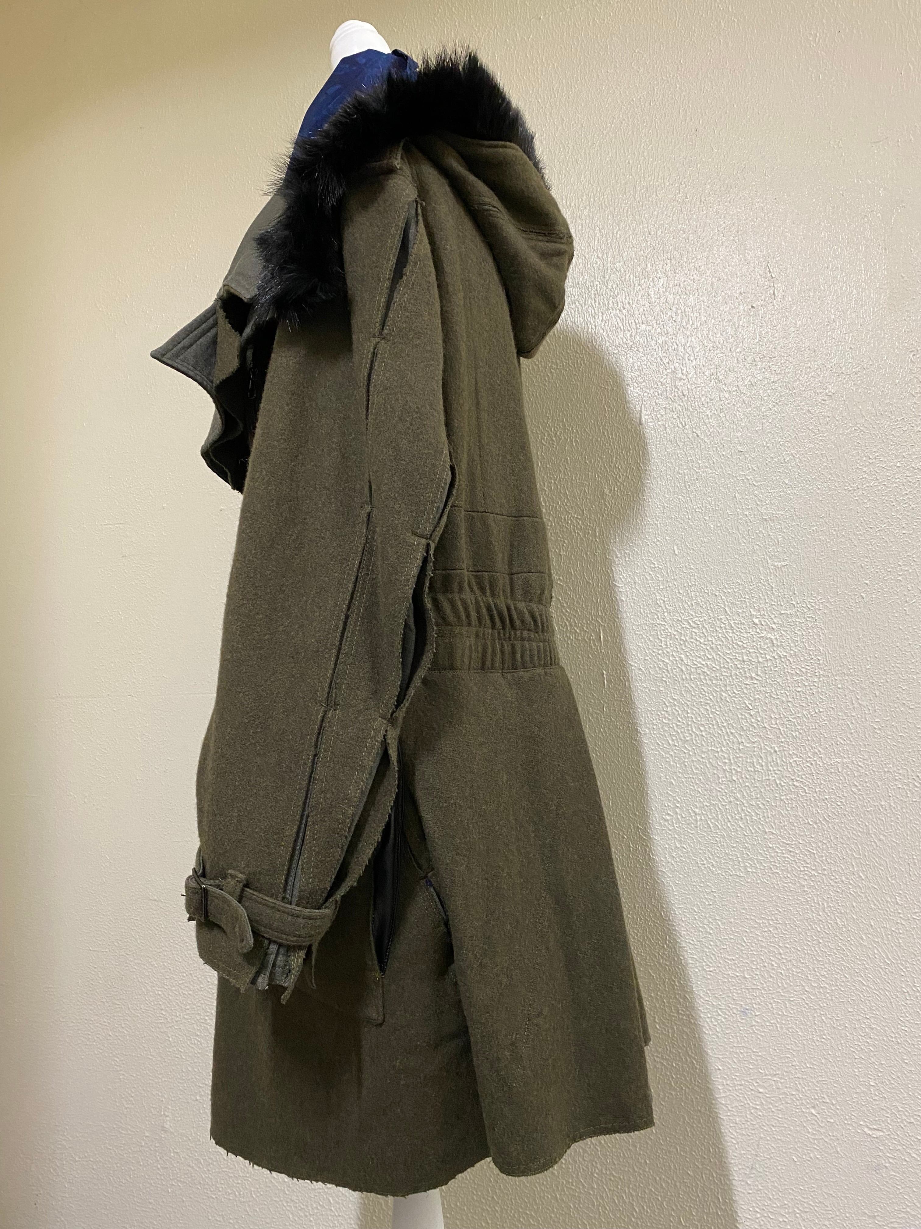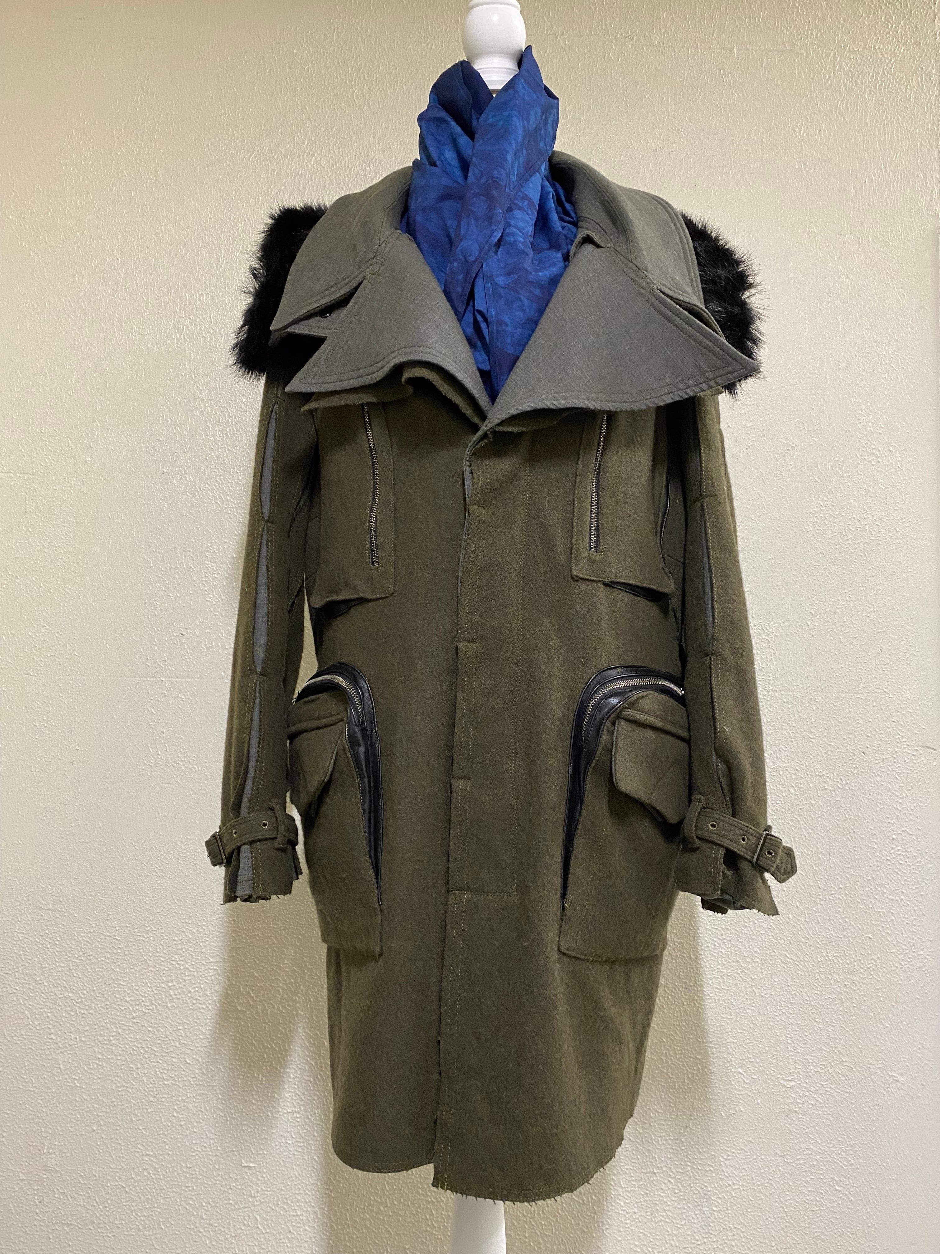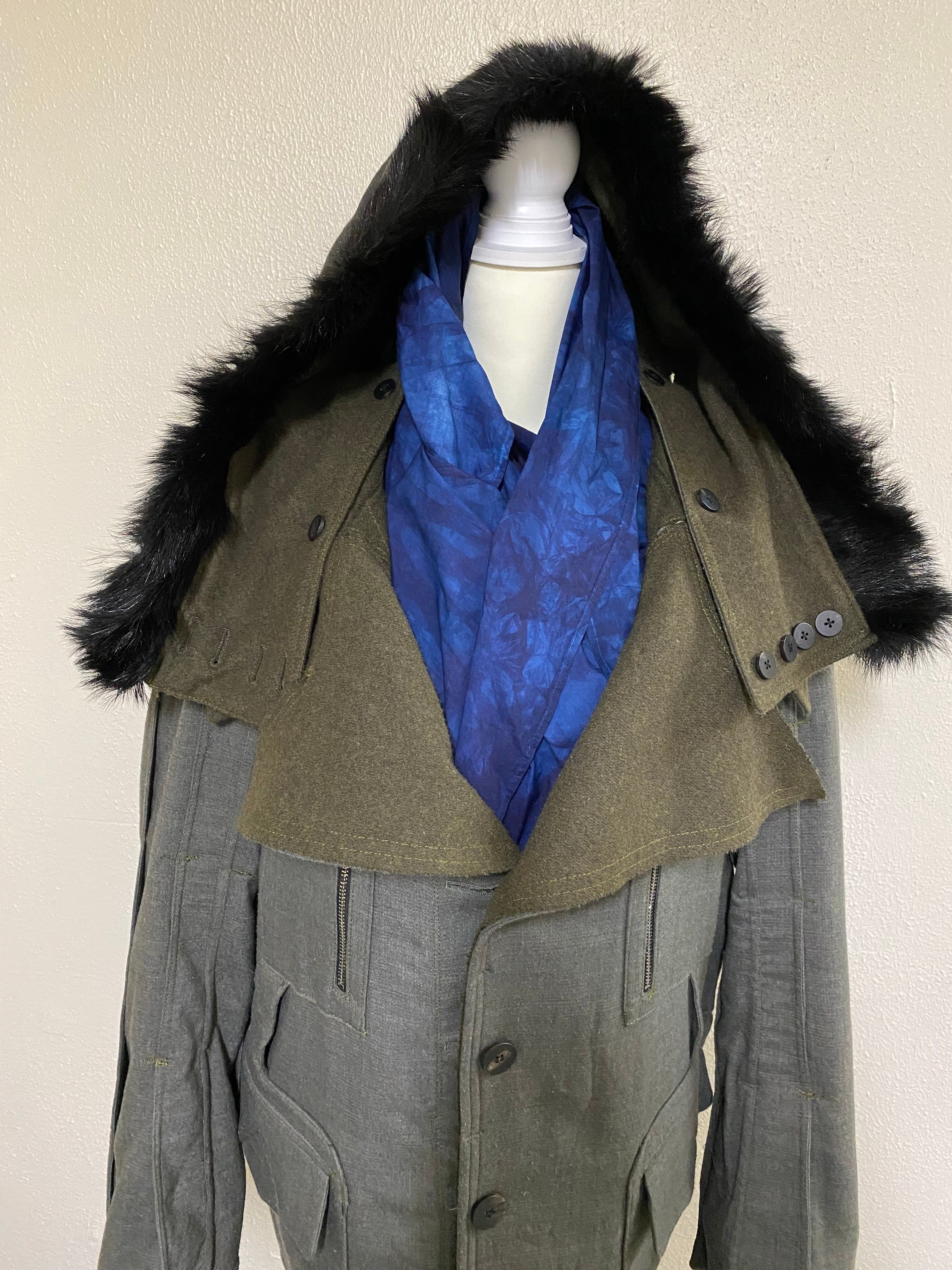 大きなフードと、腕の切り込みが個性的なデザインです。